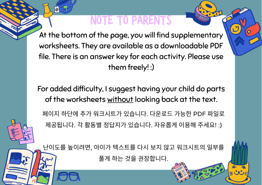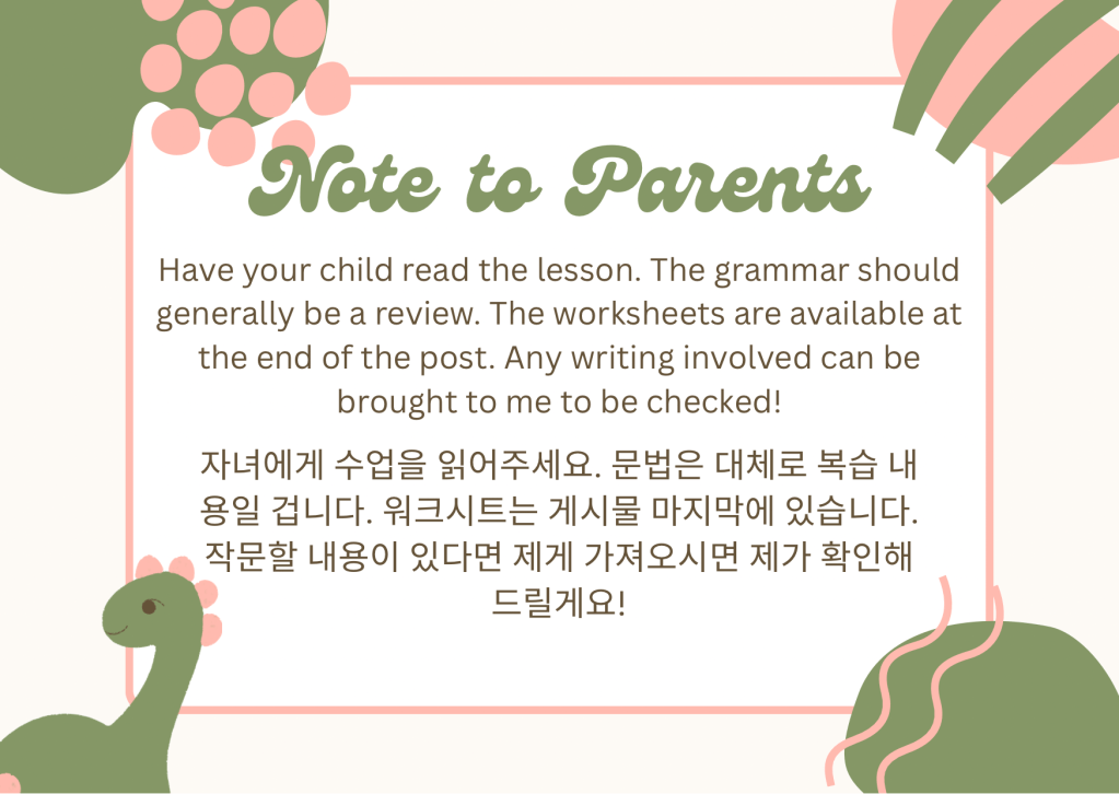 Welcome! I’m an ESL teacher based in Korea. This is my learning site for ESL 1st graders (or others!), where I’ll post free mini lessons and extra practice materials. Cheers!🌞