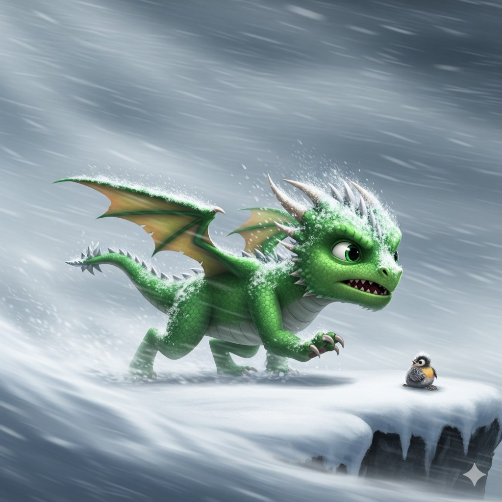 He slipped out of the cave and into the storm. The cold air bit at his scales. The wind pushed him hard, but he kept going. He was desperate to reach the small, freezing bird. He had to be quick. He could see the little bird closing its eyes, its tiny body covered in snow.