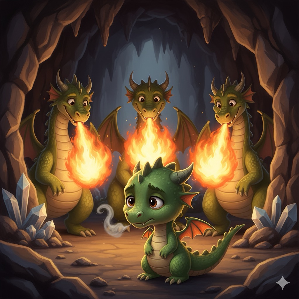Little Sparky was not like the other dragons. While they practiced breathing big, hot flames, Sparky could only puff out little gray clouds of smoke. When he tried to roar, he just coughed. Every time his friends showed off their fire, Sparky felt embarrassed. He was a dragon who could not breathe fire.