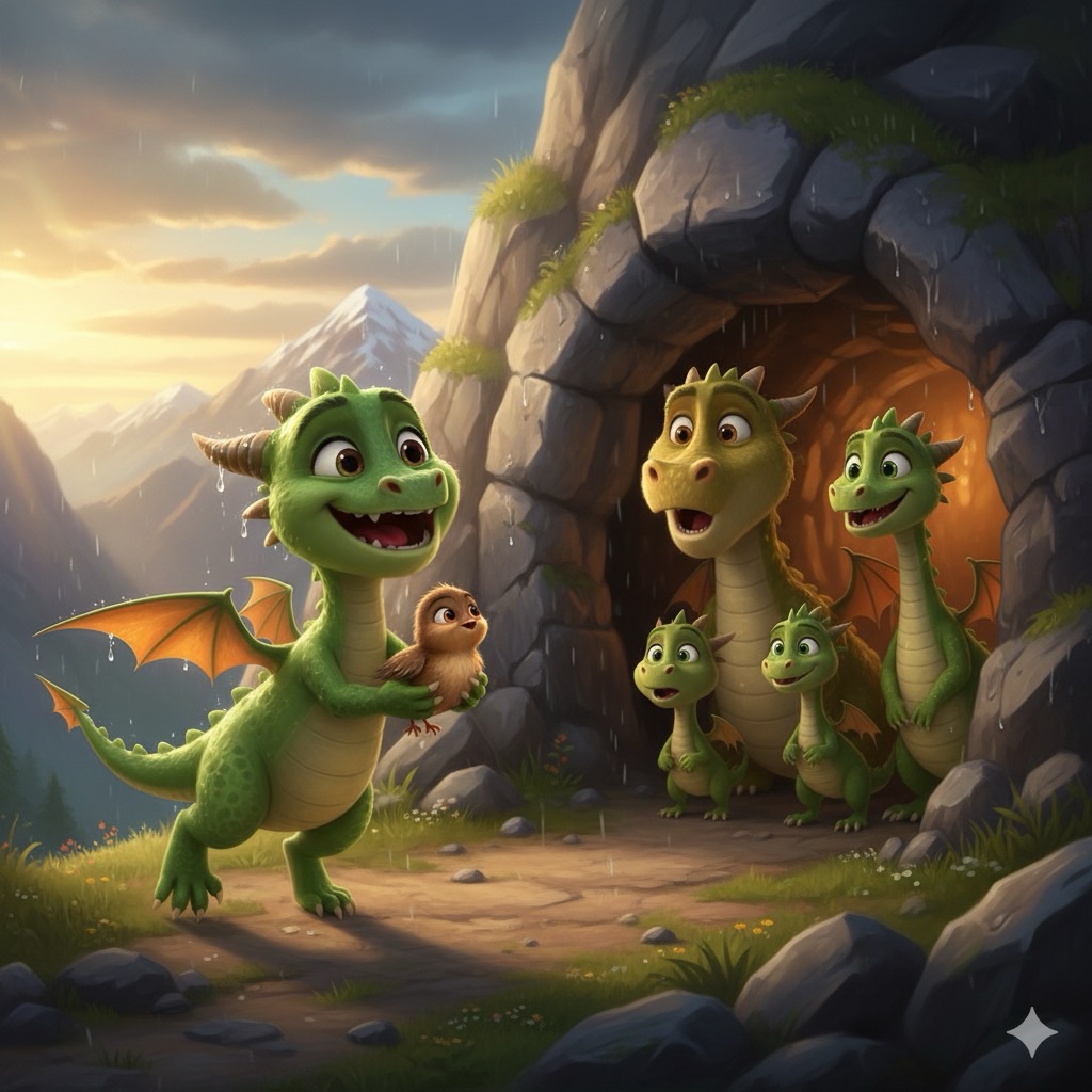 After a long time, the storm passed. The sun came out, and Sparky flew back to the cave, the little bird safe in his claws. His family saw him and were surprised. “You did it!” his father roared. “Your first fire!” But Sparky just smiled. He felt triumphant, not because he had breathed fire, but because he had saved a life.