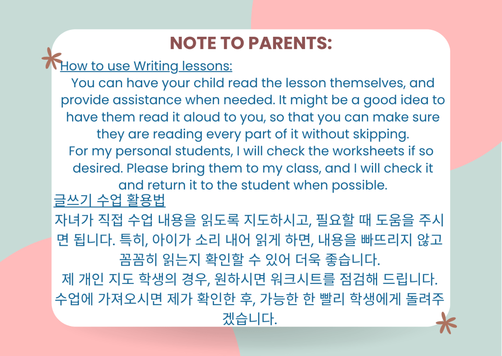 Welcome! I’m an ESL teacher based in Korea. This is my learning site for ESL 1st graders (or others!), where I’ll post free mini lessons and extra practice materials. Cheers!🌞