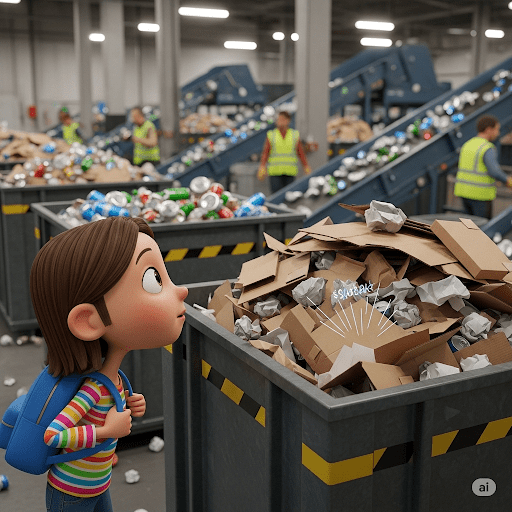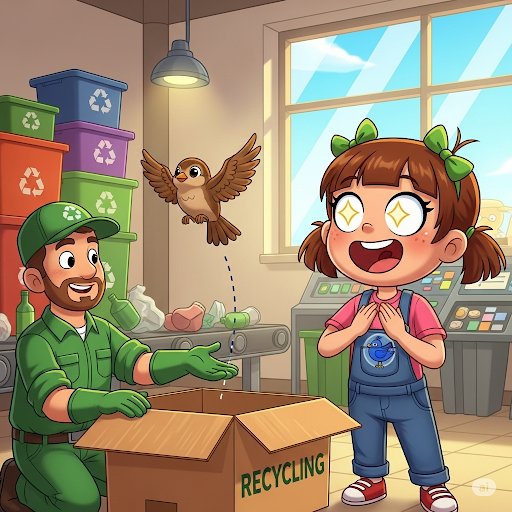 A guide showed them how big machines sorted everything with loud clanks and whirs. The whole place was like a giant, noisy labyrinth of conveyor belts and bins. Maria watched, fascinated by the organized chaos. It was interesting how old, forgotten things were being prepared to become something new. As the class walked past a tall bin overflowing with cardboard, Maria heard a minuscule sound. Chirp, chirp, chirp! It was a weak, scared sound, almost lost in the noise of the machinery. She paused, letting her friends walk ahead. She scanned the area, her eyes searching for the source of the tiny plea.