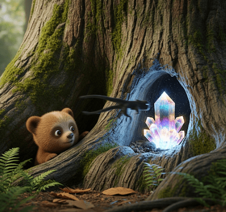 He bravely peeked into the hole. Inside, a beautiful, sparkling crystal glimmered with a powerful, rhythmic pulse. It filled the air with a strange hum, making the small hairs on Bobo’s neck stand up. He reached out a paw, drawn by its magic, but just as his paw almost touched it, a shadowy form moved swiftly across the hole.