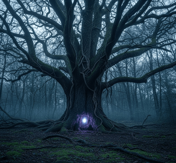 Suddenly, the path opened into a clearing. In the center, stood an enormous ancient tree, much bigger and older than any he had ever seen. Its branches twisted like gnarled, shadowy arms. The strange, pulsing light was coming from a tiny, almost hidden hole at the very base of this giant tree! Bobo felt a chilling mix of wonder and a strange sense of fear. What dark magic was inside?