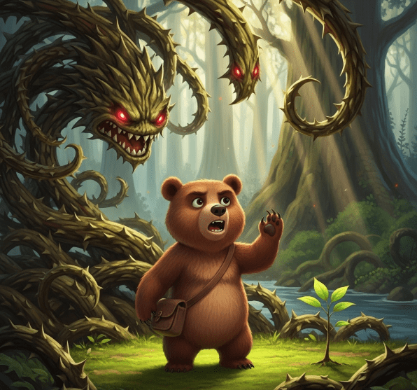 He tried to reach the crystal again, his paw trembling with anticipation. But just then, thick, thorny vines burst out from around the hole, twisting and growing, forming a menacing barrier! They were sharp, dark, and seemed to grasp at the air. “Oh no!” Bobo cried, pulling his paw back sharply. “How can I get through this?” The owl hooted, a sad, knowing sound. “Only a promise from a truly caring heart can make the thorns yield.”
