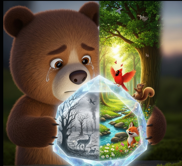 “A warning?” Bobo whispered back, his voice barely audible. “What kind of warning?” The owl dipped its head slowly. “The crystal shows the forest’s true heart. It protects us. But if you touch it without respect, it will show you what happens when that heart breaks. It shows the future if we are not careful.” A shiver of dread ran down Bobo’s spine.