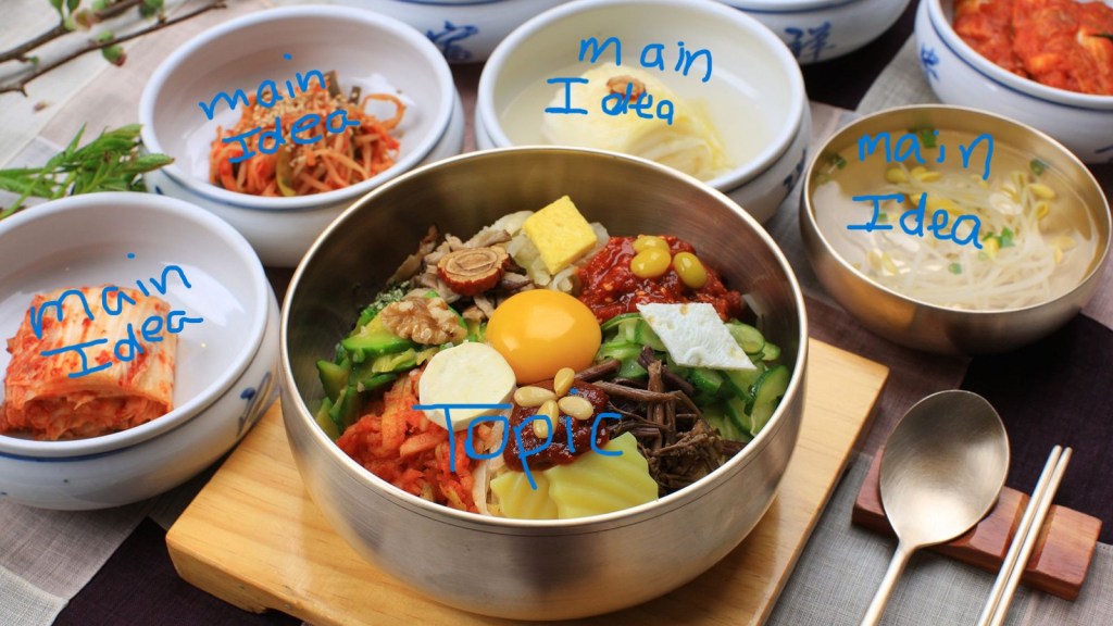 The topic is like the main dish at a restaurant, and the main idea is the side dishes that come with it.