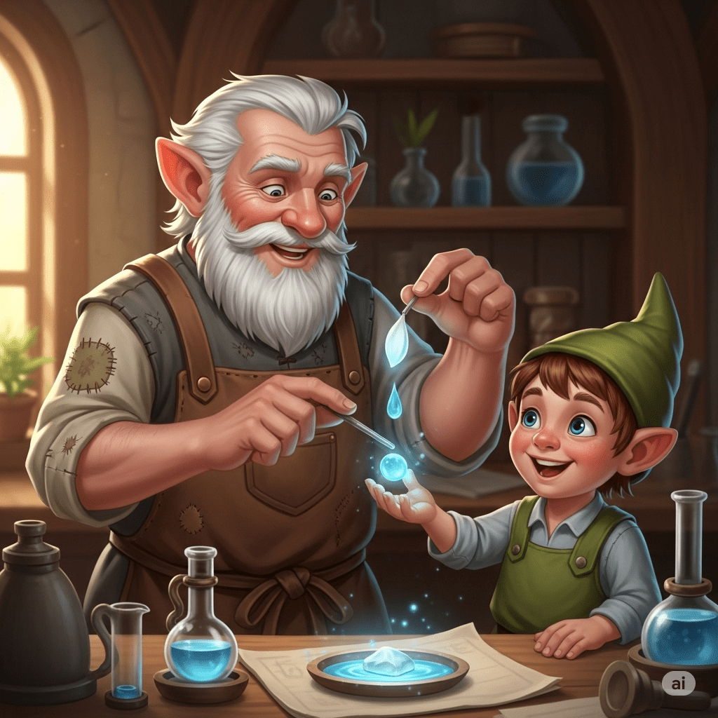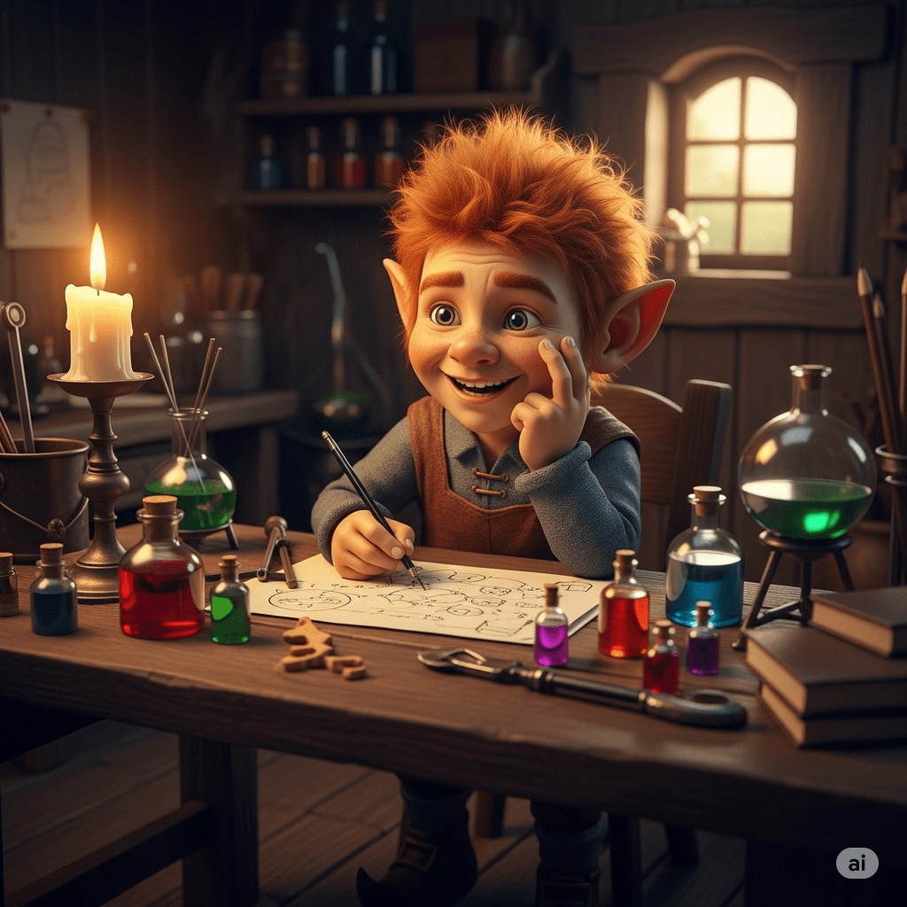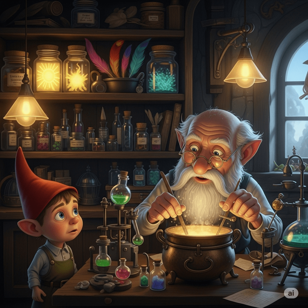 In a cozy workshop tucked inside the trunk of a giant willow tree, lived a young gnome named Pip. His ears were pointy, his hair was the color of grass, and his heart was full of big dreams. Pip was the one and only apprentice to the wisest potion-maker in the Whispering Woods, an old gnome named Master Elm. Master Elm was brilliant, but also famously grumpy. His long, white beard was burned at the tips from leaning too close to bubbling cauldrons. All day long, Pip dreamed of creating magnificent potions that shined with rainbow colors.
